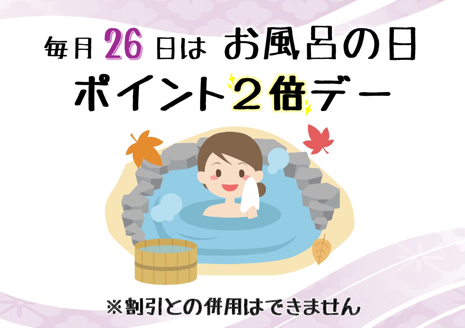 26日はお風呂の日!ポイント2倍!! 26日は、「お風呂」の日!! 通常料金で入館した方は、ポイント2倍!! ※ポイントカードは、他の割引との併用はできません。 Post Share Hatena Pocket RSS feedly Pin it イベント一覧 2025年7月26日 2025 7月 季節の薬湯【桃の葉湯】 峠の湯では、お客様皆様により峠の湯の温泉をお楽しみ頂きたく、季節の薬湯を毎月恒例イベントにすることと致しました😊毎月変わる薬湯をぜひ、お楽しみ下さい!!7月の薬湯は「桃の葉湯」です! 14:30~17:00 ポップス尺八「すまいる」演奏会 (毎月第4日曜日) 高崎市を中心に活動されている、群馬県高崎市出身のアーティスト「けん&さゆり」さん。尺八のやわらかな音色に、包まれてみませんか。
